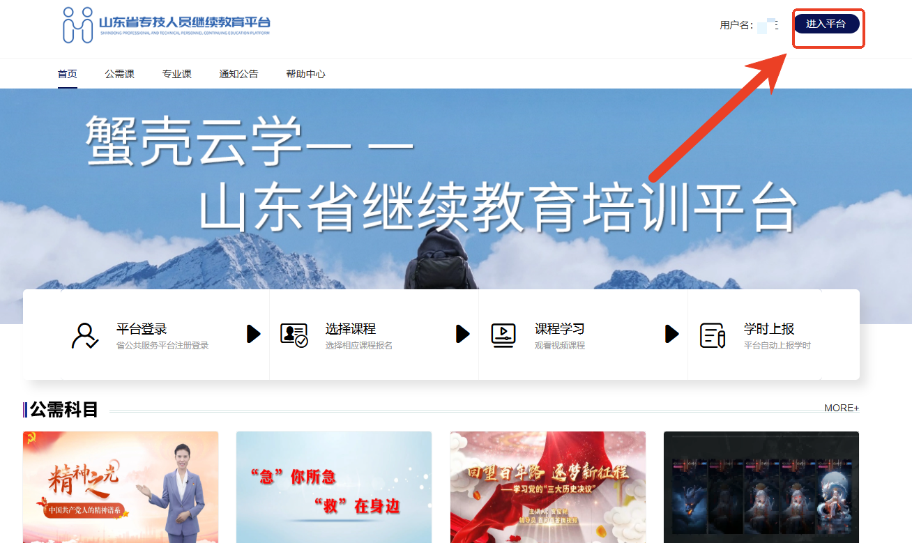 登录成功后,击右上角的【进入平台】--【课程中心】--【公需课/专业课】根据年度和专业分类进行选课